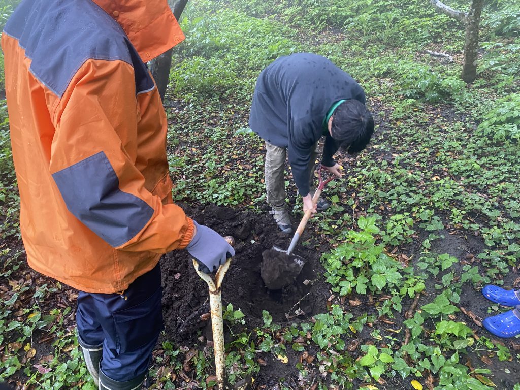 川がない理由として、利島に広がる火山岩類は亀裂に富み、透水性が非常に高いことが挙げられています(熊井・工藤, 1979)。実際に雨が降った後も、土を掘った穴に水が溜まることはなく、浸透している様子が確認されました。